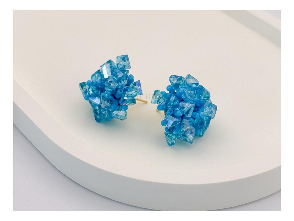 Jsou tvořeny drobnými modrými korálky a facetovanými krystaly, které vytvářejí krásnou strukturu s jemným leskem. Zadní část doplňuje zlatý kovový základ, který dodává celku eleganci a stabilitu.