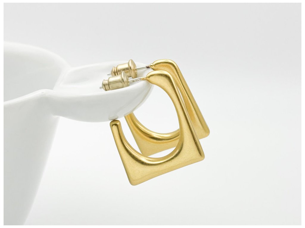 Tyto luxusní náušnice kombinují moderní design s jemnou elegancí. Jejich jedinečný tvar připomínající čtverec s oblými liniemi dodává náušnicím nádech originality. Povrchová úprava z 14K zlata zajišťuje matný a sofistikovaný vzhled, zatímco puzety z kvalitního 925 stříbra poskytují pohodlné a bezpečné nošení. Náušnice jsou lehké a příjemné na nošení, přesto působí robustním dojmem díky svému výraznému tvaru.