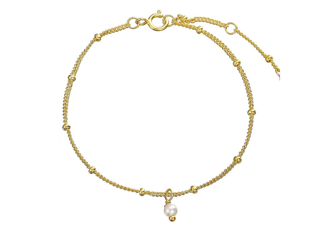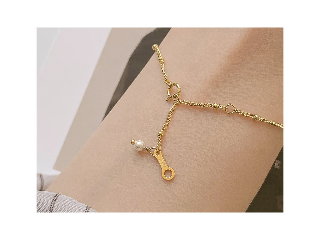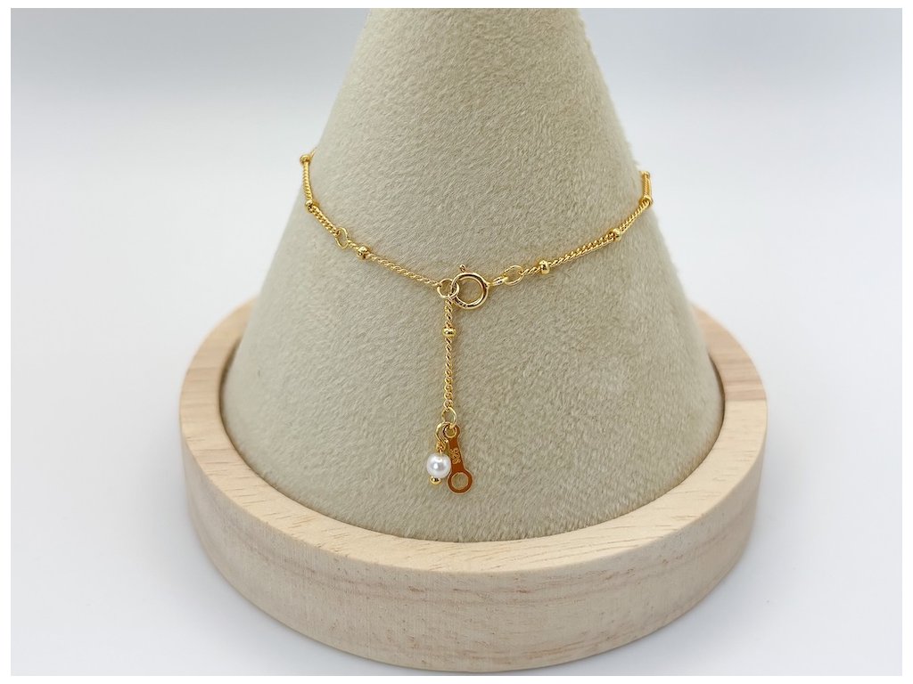 Tento zlatý náramek je vyrobený z kvalitního stříbra 925 a pozlacený 18K zlatem. Jemný řetízek je ozdoben imitovanými perlami, které dodávají náramku jemnost a eleganci. Náramek má zapínání na karabinku a délku 15 cm + 4.5 cm prodloužení, což zajišťuje pohodlné přizpůsobení každé velikosti zápěstí. S hmotností 1 g je náramek lehký a ideální pro každodenní nošení nebo pro zvláštní příležitosti.