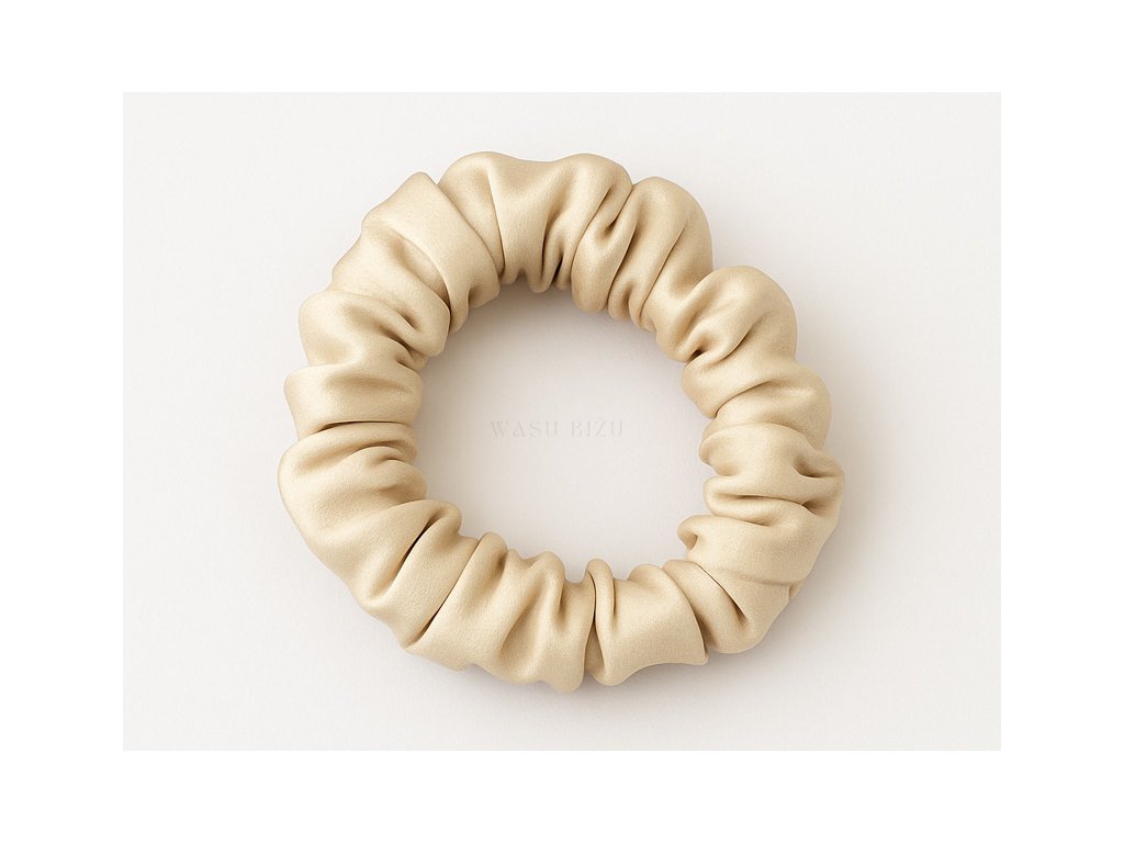 Luxusní hedvábné scrunchie v barvě šampaňského o šířce 2 cm, které jemně drží vlasy a dodává elegantní a sofistikovaný vzhled.
