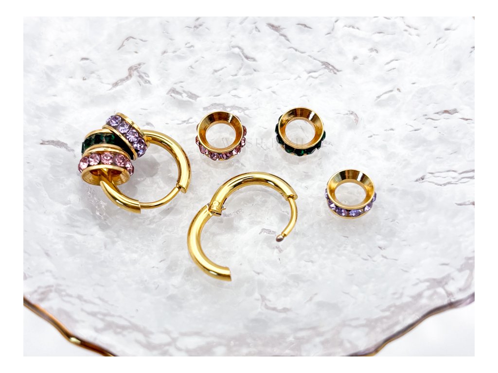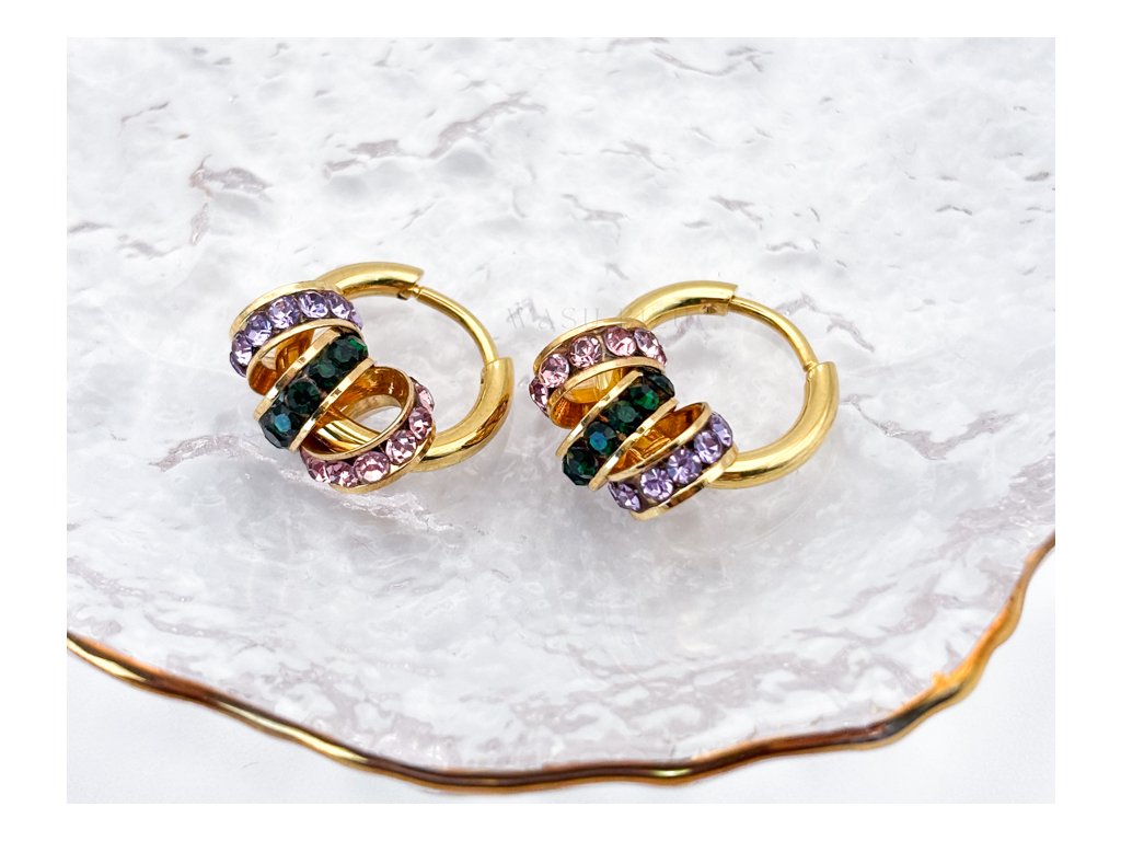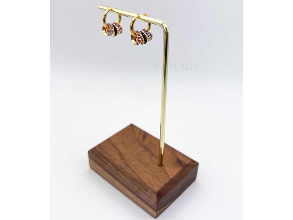 Jsou tvořeny z pozlacené mosazi a zdobeny třemi kroužky s třpytivými zirkony v odstínech světle fialové, tmavě zelené a růžové.
